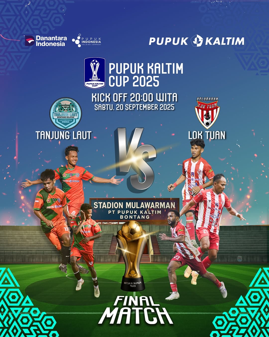 Bontang. Final Pupuk Kaltim Cup 2025 akhirnya digelar dan akan mempertemukan dua tim terbaik, Tanjung Laut dan Lok Tuan, dalam laga penuh gengsi di Stadion Mulawarman, PT Pupuk Kaltim, Bontang. Pertandingan puncak ini dijadwalkan berlangsung malam ini, Sabtu (20/9/2025) dengan kick-off dimulai pukul 20.00 WITA. Atmosfer meriah dipastikan menyelimuti stadion, mengingat keduanya tampil impresif sepanjang turnamen.