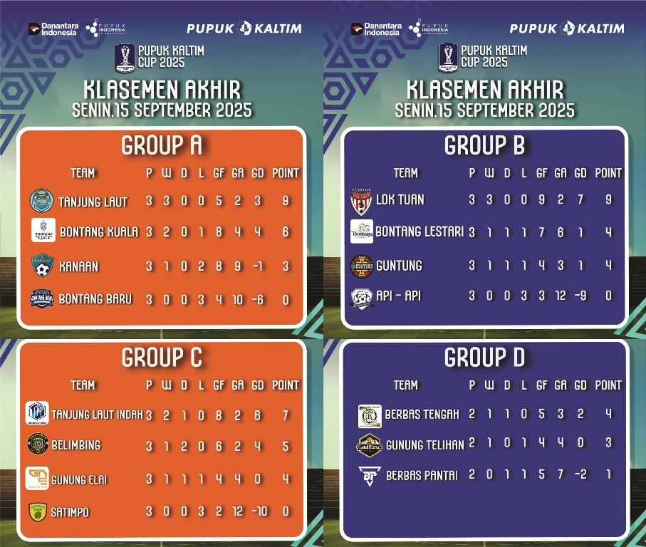 Bontang. Klasemen akhir Pupuk Kaltim Cup 2025 akhirnya resmi keluar, delapan tim terbaik kini siap membuat lapangan semakin panas di babak selanjutnya. Empat grup telah melahirkan dua tim terbaiknya masing-masing, dan kini delapan besar peserta siap melangkah ke perempat final. Pertandingan- pertandingannya dijamin lebih seru dan lebih tegang.