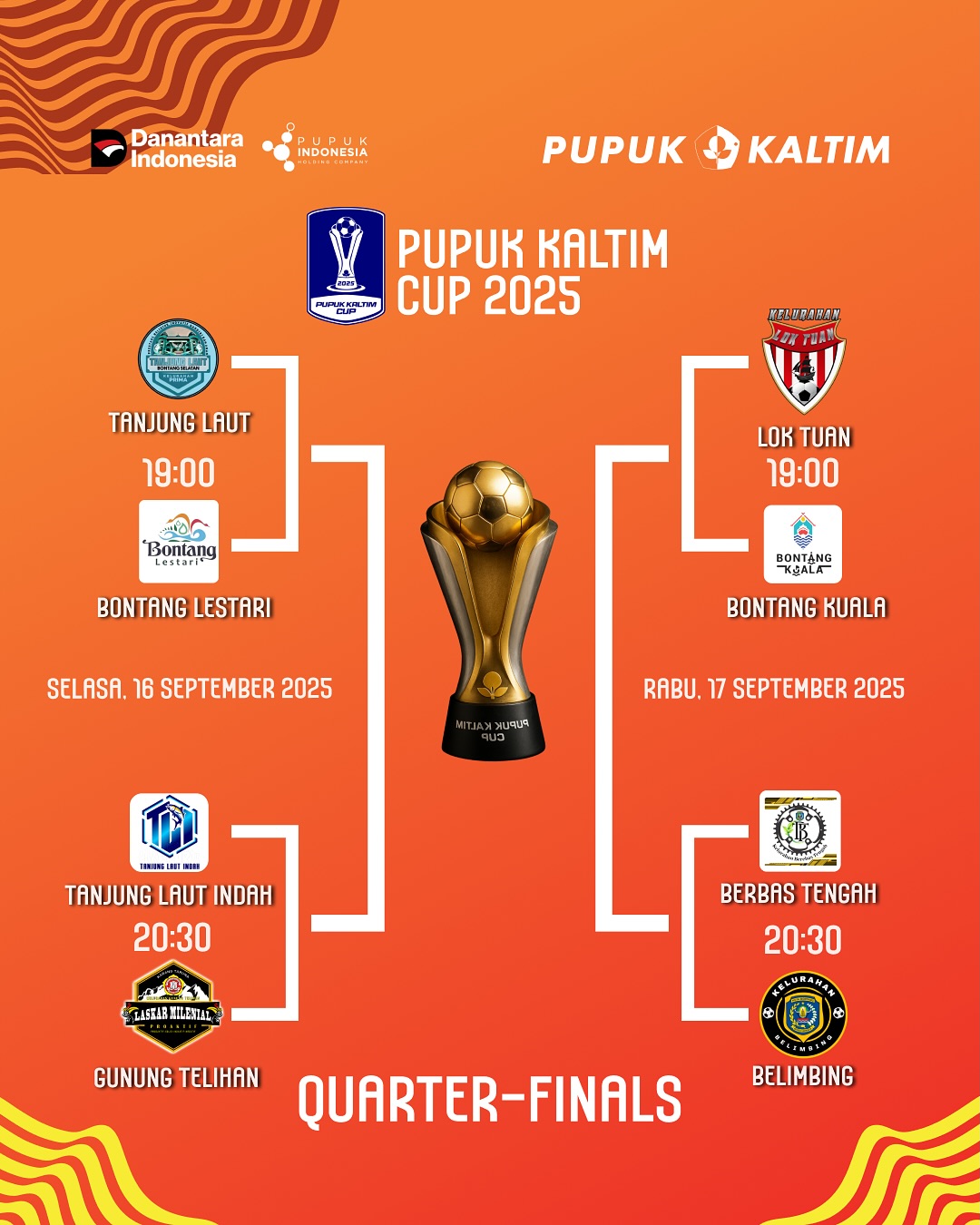 Kemudian, pertandingan akan berlanjut pada Rabu, 17 September 2025. Pertandingan pembuka mempertemukan Lok Tuan melawan Bontang Kuala pada pukul 19.00 WITA. Setelah itu, laga terakhir di babak perempat final akan mempertemukan Berbas Tengah melawan Belimbing pada pukul 20.30 WITA.